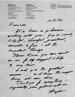 I was very fortunate to work for a while for a senior civil servant in Ontario. Angela Longo upon taking up another assignment wrote personalized hand written messages for her staff. I’ve kept mine not only because it says nice things about me but because it reminds me of a classy lady.