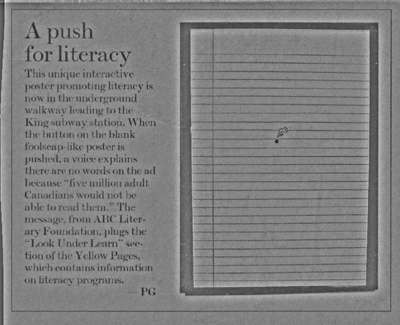 A newspaper clipping explaining “When the button on the blank foolscap-like poster is pushed, a voice explains there are no words on the ad because ‘five million adult Canadians would not be able to read them.'”