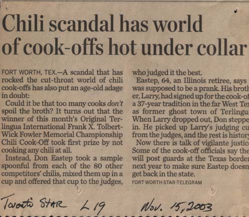 Newspaper clipping Toronto Star Nov 15 2003 - Chili scandal