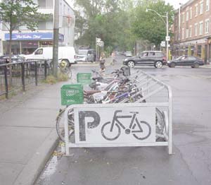 And displacing car parking with a whole row of city-friendly transportation is the coral for bikes near the location of the Bloor-Borden Farmers Market.