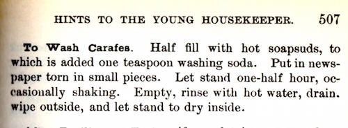 To Wash Carafes. Half fill with hot soapsuds, to which is added one teaspoon washing soda. Put in newspaper torn in small pieces. Let stand one-half hour, occasionally shaking. Empty, rinse with hot water, drain. [W]ipe outside, and let stand to dry inside.