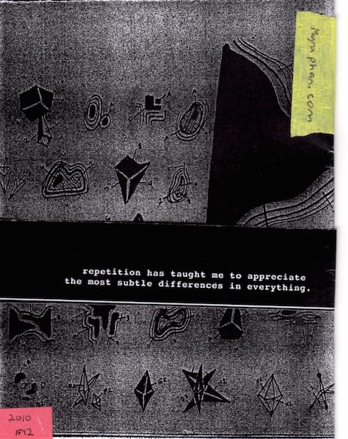 Myra Phan proves more illusive. Some online presence relating to OCAD. The URL artfully inscribed by hand on a small piece of tape on the cover her zine sketchbook is now defunct. The WayBackMachine at the Internet Archive records a posting captured Dec 11 (2008) presenting and promising “Another anatomically incorrect drawing: I’m going to make a series of them and bind them all together”. Myra’s zine comes with a strip of paper wrapping round the covers providing the only words to accompanying photoreproduced sketches inside.