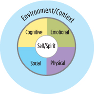Stepping Stones places Self/Spirit at the hub. On the perimeter is the Environment/ Context. Distributed in the four quadrants are Social, Physical, Emotional and Cognitive. The Stepping Stones model is also referenced in the Ontario education curriculum (See Grade 1 to 6 Social Studies Curriculum Guide and the Grade 7 to 8 History and Geography http://www.edu.gov.on.ca/eng/curriculum/elementary/sshg18curr2013.pdf).