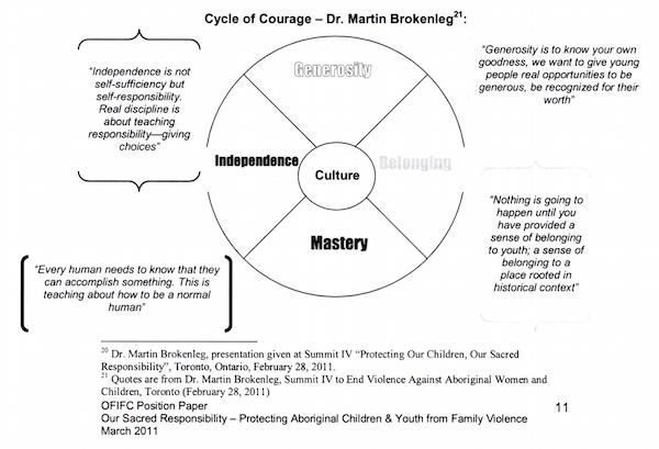 The OFIFC paper puts forward an Aboriginal Resiliency framework based on the Cycle of Courage (Belonging, Mastery, Independence, and Generosity) developed by Martin Brokenleg and which places Culture at the centre.