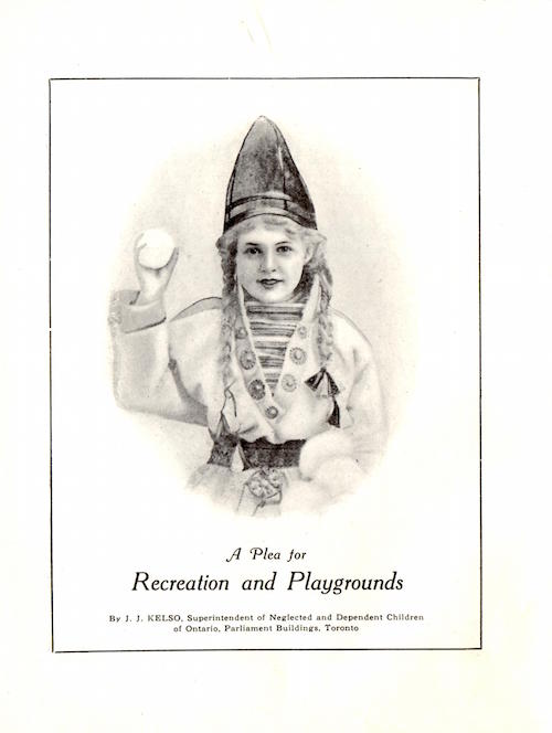 A 1914 pamphlet, “PLAYGROUNDS: One of Canada’s Great Needs” billed as a “Call to service for the children of the future” authored by J.J. Kelso, Superintendent of Neglected and Dependent Children of Ontario.