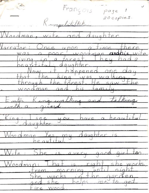 I remember playing the role of Rumplestiltskin in a school play back in grade one or grade two. The tune and lines of the little man’s song have been with me since. “Rumplestiltskin, one two, three.” I thought that this was the beginning of the song and the rest constantly escaped me. I retrieved the mimeographed script from a trunk and found that it was the end — no wonder I couldn’t recall la suite!