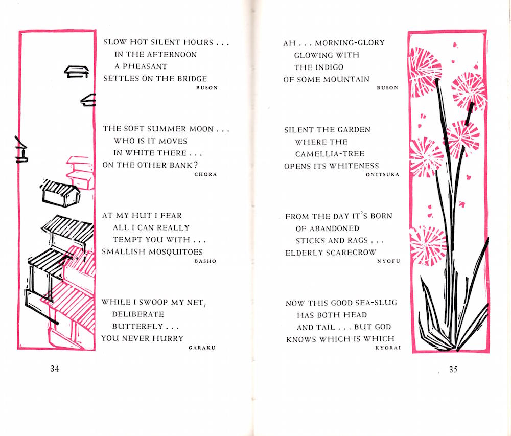 Two lines that bring to mind for me the subtle art of Jeff Hill who did the decorations and lettering for Peter Pauper Press’s Cherry-Blossoms: Japanese Haiku Series III (1960)