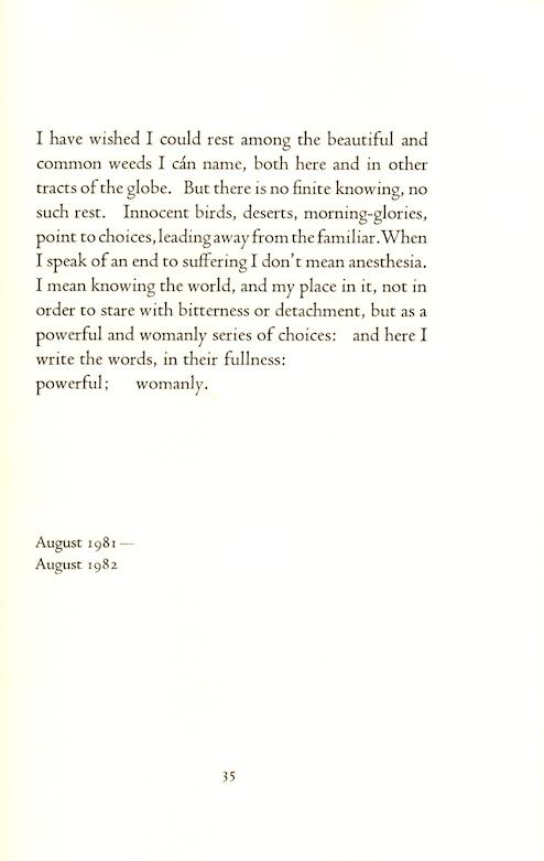 When I speak of an end to suffering I don’t mean anesthesia. I mean knowing the world, and my place in it, not in order to stare with bitterness or detachment, but as a powerful and womanly series of choices:    and here I