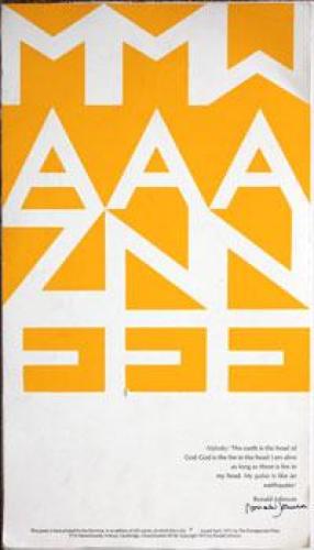 I got to see this broadside at the Thomas Fisher Rare Book Library. It was issued by Karyl Klopp’s Pomegranate Press in 1973. It’s a concrete poem by Ronald Johnson. Bright yellow with inventive use of letter forms and negative space