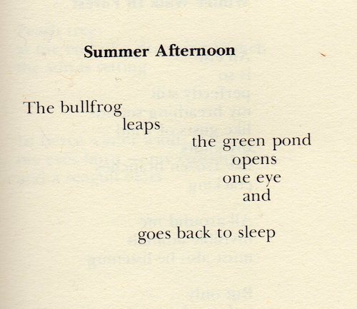 A machine-readable string: Summer Afternoon The bullfrog leaps the green pond opens one eye and goes back to sleep