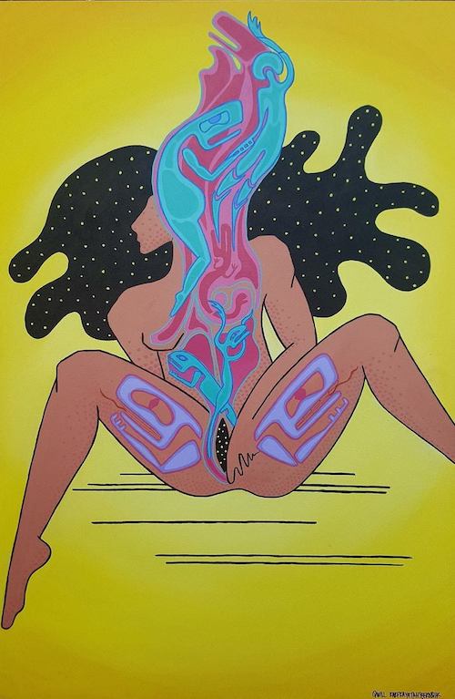 Second, visual work by Quill Christie-Peters from a series focused on the land and woman’s self-pleasuring as an act of reclaiming the Anishinaabe body as homeland. Her words are a key to reading the work.