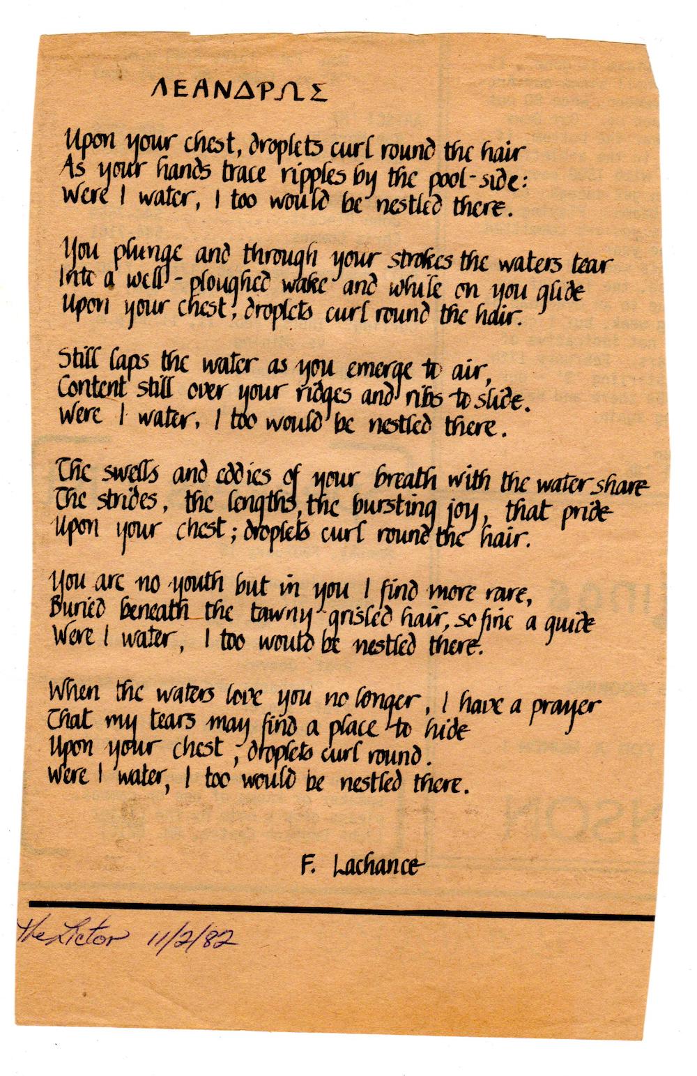 I recalled something from my undergraduate days at Queen’s (Kingston). Here then is the text of Leander which I swear was written long before I knew of Schyler’s poem.