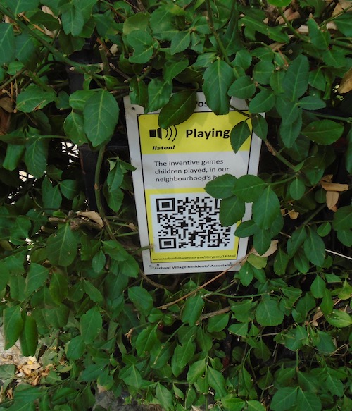 While out on a daily walk, I spotted the sign for it in the Harbord Village neighbourhood. Not having a phone (I couldn’t access the QR code and listen) I enjoyed the delayed gratification of following a URL (captured via a camera I carried) and of listening at leisure to the cascade of voices.